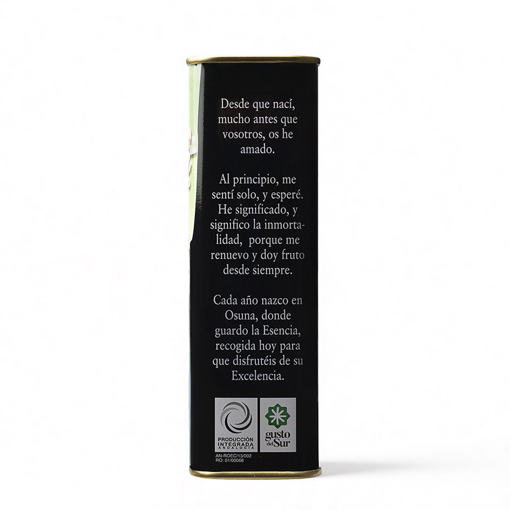 Con un diseño elegante y un toque de modernidad, la lata también resalta la poesía de la tierra y la cultura local, como muestra de un producto cuidadosamente elaborado. «Esencia» no es solo un aceite de oliva virgen extra, es un homenaje a la inmortalidad de la naturaleza y su capacidad para ofrecer frutos año tras año. Ideal para ensaladas, pescados, carnes, y otros platos que deseen un toque gourmet y saludable.