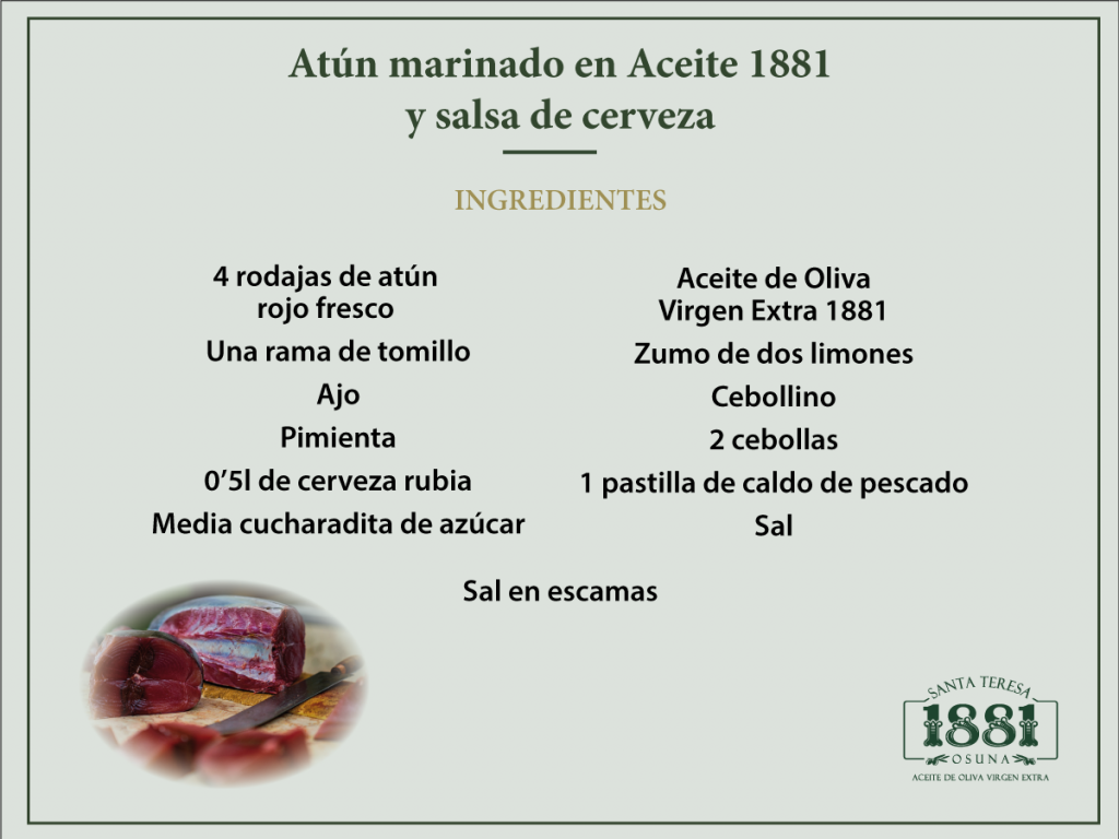 Es el caso del Atún Rojo, un codiciado espécimen propio del mar andaluz que tolera marinajes para comerse crudo o cocciones de cualquier tipo, ya sean rápidas –a la plancha– o más reposadas –encebollado o con salsa de cerveza–. Así, con esta última opción vamos a llevar a cabo distintos usos de nuestro Aceite de Oliva Virgen Extra 1881 que detallamos a continuación.