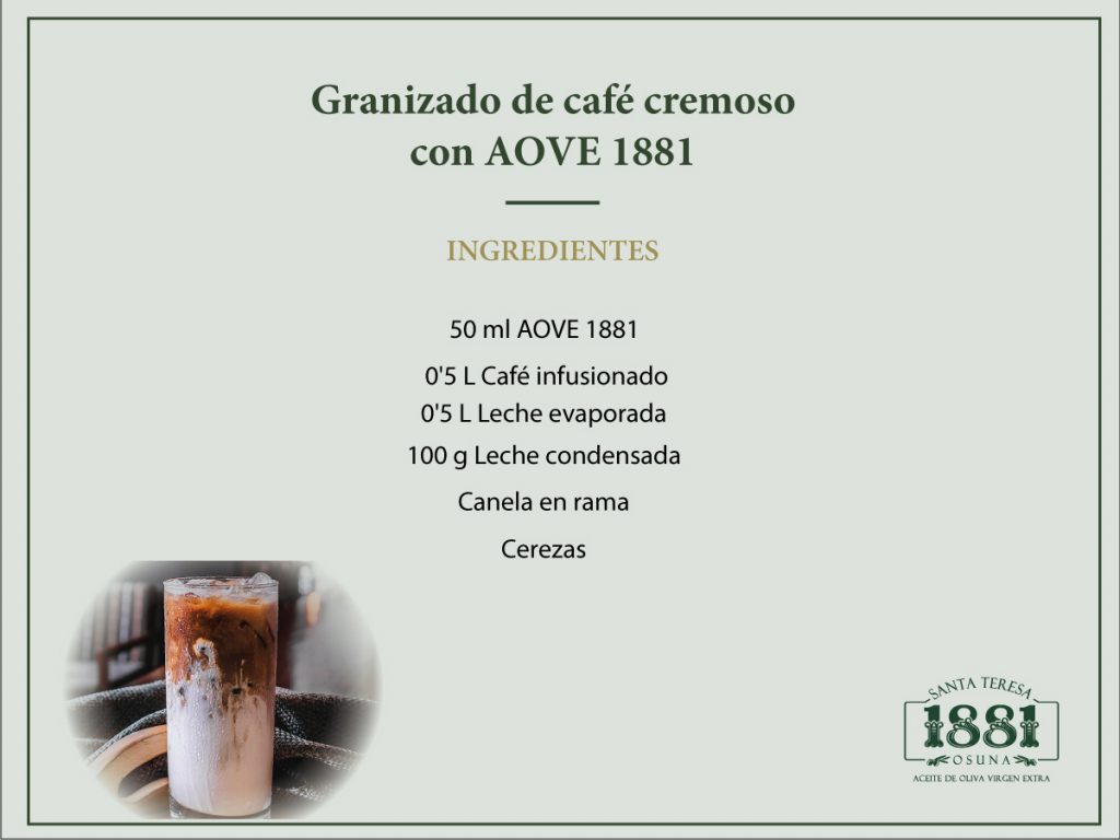 Esta semana traemos una receta que los más cafeteros van a disfrutar mucho: un granizado de café cremoso con Aceite Oliva Virgen Extra 1881, el toque de nuestro oro líquido le da esa textura tan suave al paladar.