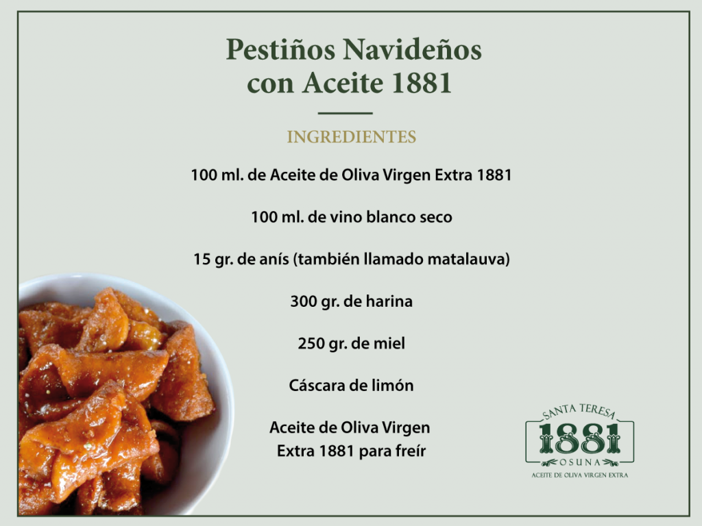 Son pequeños bocados exquisitos elaborados con harina, miel o anís -o matalauva, conocido también popularmente-, entre otros ingredientes. Se fríen en Aceite de Oliva Virgen Extra y qué mejor manera que en Aceite 1881.